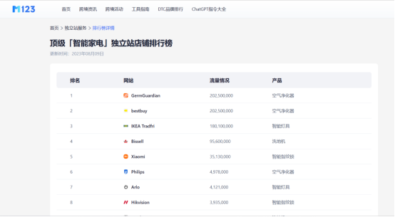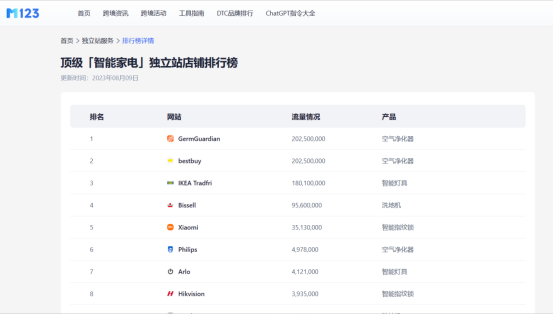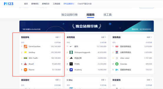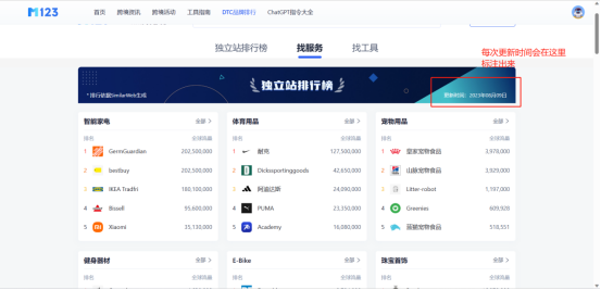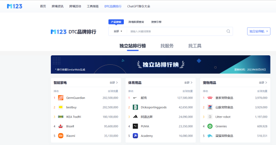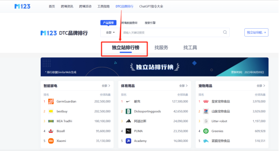 M123跨境工具导航站(https://www.m123.com/)内置功能【DTC品牌排行】已经根据SimilarWeb的数据统计为大家罗列每天最新的排行榜变化,同时这个榜单也能体现出独立站一系列客观的指标。