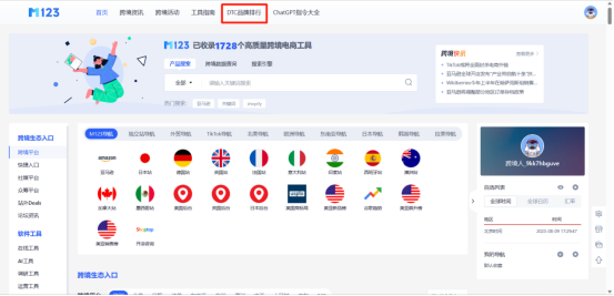 1.登录M123跨境工具导航站,网址:https://www.m123.com/,点击【DTC品牌排行】选项。