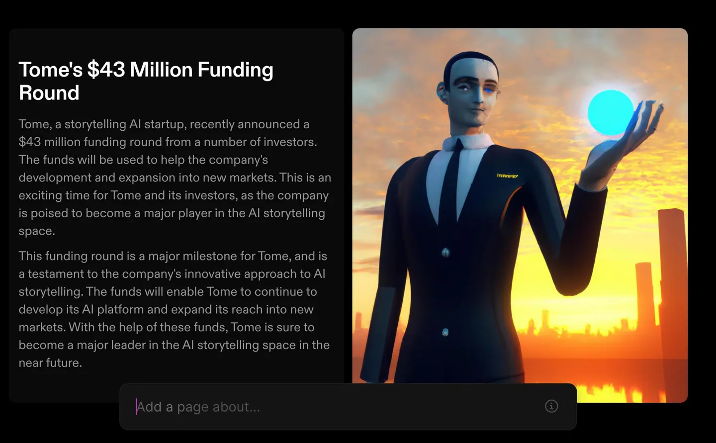 Tome 的软件通过软件重新思考了幻灯片友好、统一的图块的 PowerPoint 系统,该软件可以自动放置和调整拖放到其画布上的文本和图像。与传统的演示文稿不同,Tome 磁贴是模块化的,对一个磁贴的更改会动态更新其他磁贴。自从集成了人工智能以来,Tome 还使用多个大型语言模型在幕后进行大量查询,以满足用户的演示提示。首先,它的软件为输出生成一个框架,设置其长度和样式;接下来,对 AI 模型的较小查询会填充相应的图像和文本。然后,用户可以微调结果或要求 AI 通过额外的提示生成更多页面。