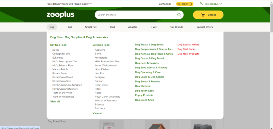 Zooplus 的核心优势在于其丰富的产品线和优质的客户服务。公司与众多知名宠物用品品牌合作,确保了产品的多样性和高品质。与此同时,作为线上零售平台,Zooplus 还拥有超三十多种自有品牌,其中最为核心的自有品牌有Wolf of Wilderness(高端天然粮)和Concept for Life(处方粮) 。在客户服务方面,Zooplus提供了灵活的退换货政策、快速配送服务以及专业的客户支持,Zooplus 通过多语言网站和本地化服务,成功适应了不同国家市场的需求,同时利用社交媒体和在线营销活动来增强品牌影响力。
