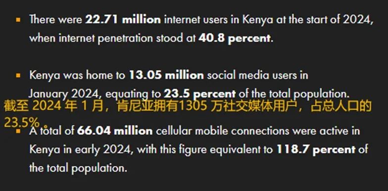 随着互联网与智能手机的普及,社交平台的大流行使得社交电商成为非洲电商的新风口。据DataReportal数据显示,截至2024年初,肯尼亚18岁以上的社交媒体用户已经达到了1305万,其中49%的肯尼亚用户通过 TikTok、Instagram、Facebook、WhatsApp等社媒平台购物。