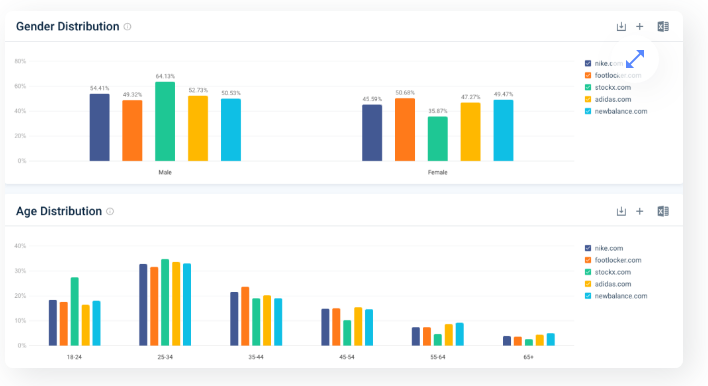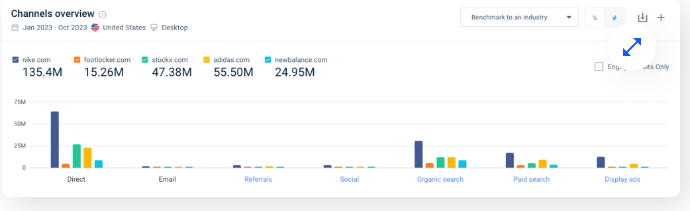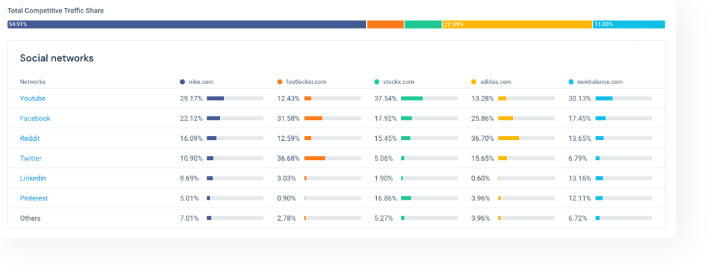 类似Similarweb这样的工具深入挖掘流量来源,包括每个频道背后的数字. 你可以甚至查看不同社交媒体平台和推荐的细节,发现可能会吸引你的受众的合作关系,让他们选择你的竞争对手而不是你。