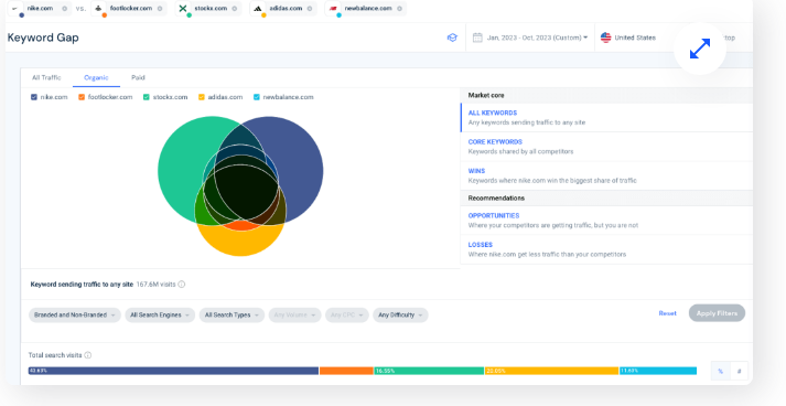 然而,竞争对手之所以成为竞争对手有很多原因——这不仅仅是因为一般的网站流量。考虑他们的SEO和PPC活动,并运行一个内容差距分析和关键词差距分析看看你错过了什么,为你自己的网站寻找机会。